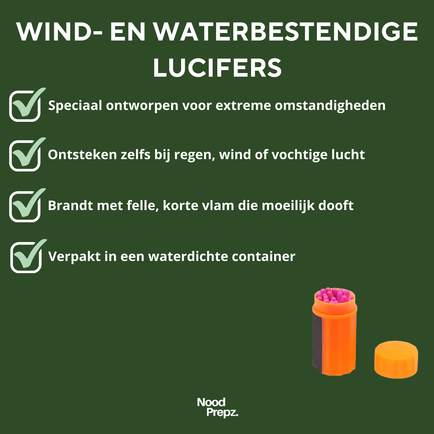 Speciale lucifers die werken onder extreme omstandigheden. Blijven branden in regen en wind. Extra lange brandkop voor veilig aansteken. Waterdichte container met aanstrijkvlak. -