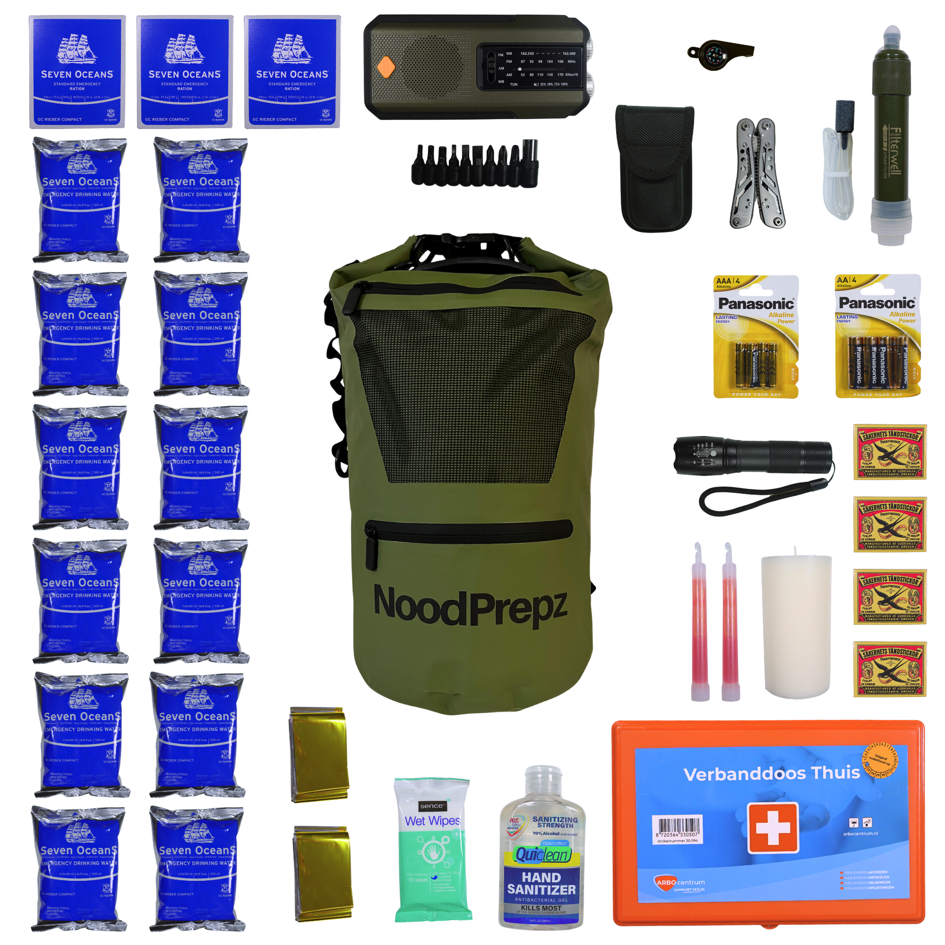 Dit complete noodpakket bevat alle essentiële onderdelen die de overheid adviseert om 72 uur zelfredzaam te zijn, aangevuld met extra handige benodigdheden zoals een waterfilter.